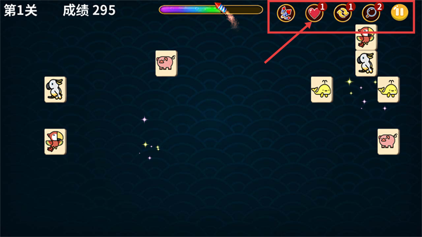 3、在進(jìn)程中,【成績(jī)-295】時(shí)可借助右上角道具圖標(biāo)輔助,剩余圖案減少后需精準(zhǔn)匹配以加快闖關(guān)節(jié)奏。