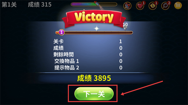 4、通關(guān)后出現(xiàn)【Victory】提示,查看【關(guān)卡-1】對(duì)應(yīng)的【成績(jī)-3895】數(shù)據(jù),點(diǎn)擊【下一關(guān)】按鈕繼續(xù)挑戰(zhàn)后續(xù)關(guān)卡。