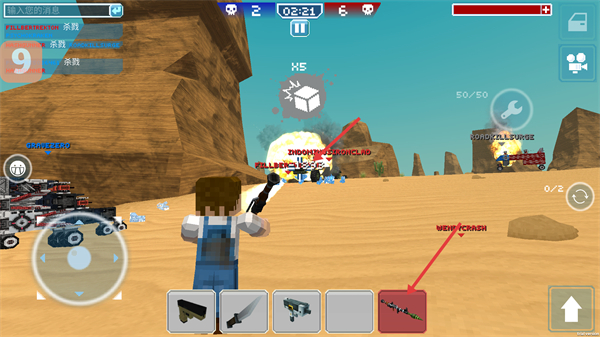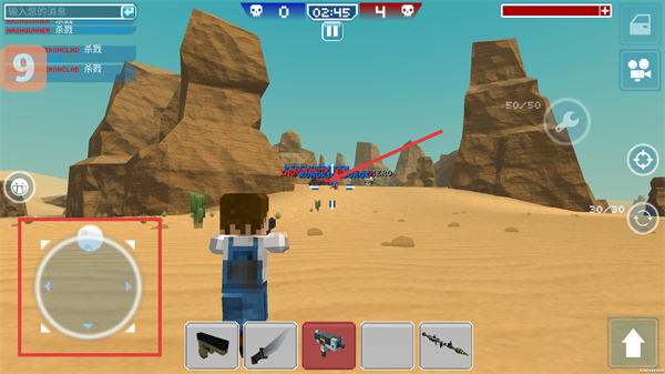 2、進(jìn)入戰(zhàn)斗后,通過方向控制按鈕移動(dòng)角色,切換武器欄裝備,關(guān)注【02:45】倒計(jì)時(shí),攻擊敵方積累擊殺數(shù)。