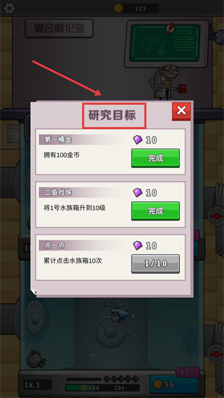 4、在【研究目標】界面,完成如【擁有100金幣】等任務后點擊【完成】,可領取鉆石獎勵,用于解鎖更多功能。