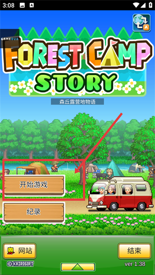 1、進入森丘露營地物語的啟動界面后,點擊【開始游戲】按鈕可進入露營地經(jīng)營玩法,【紀錄】按鈕用于查看存檔。
