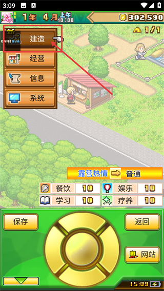 2、在游戲界面點擊【建造】按鈕,可展開設(shè)施建造等功能,當(dāng)前露營熱情為【普通】,餐飲、娛樂等數(shù)值均為10,資源顯示【302/530】。