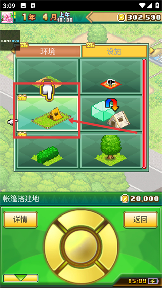 3、進入【設(shè)施】界面后,選擇【帳篷搭建地】選項,消耗【20-000-金幣】即可建造該設(shè)施,拓展露營地的游客容納空間。