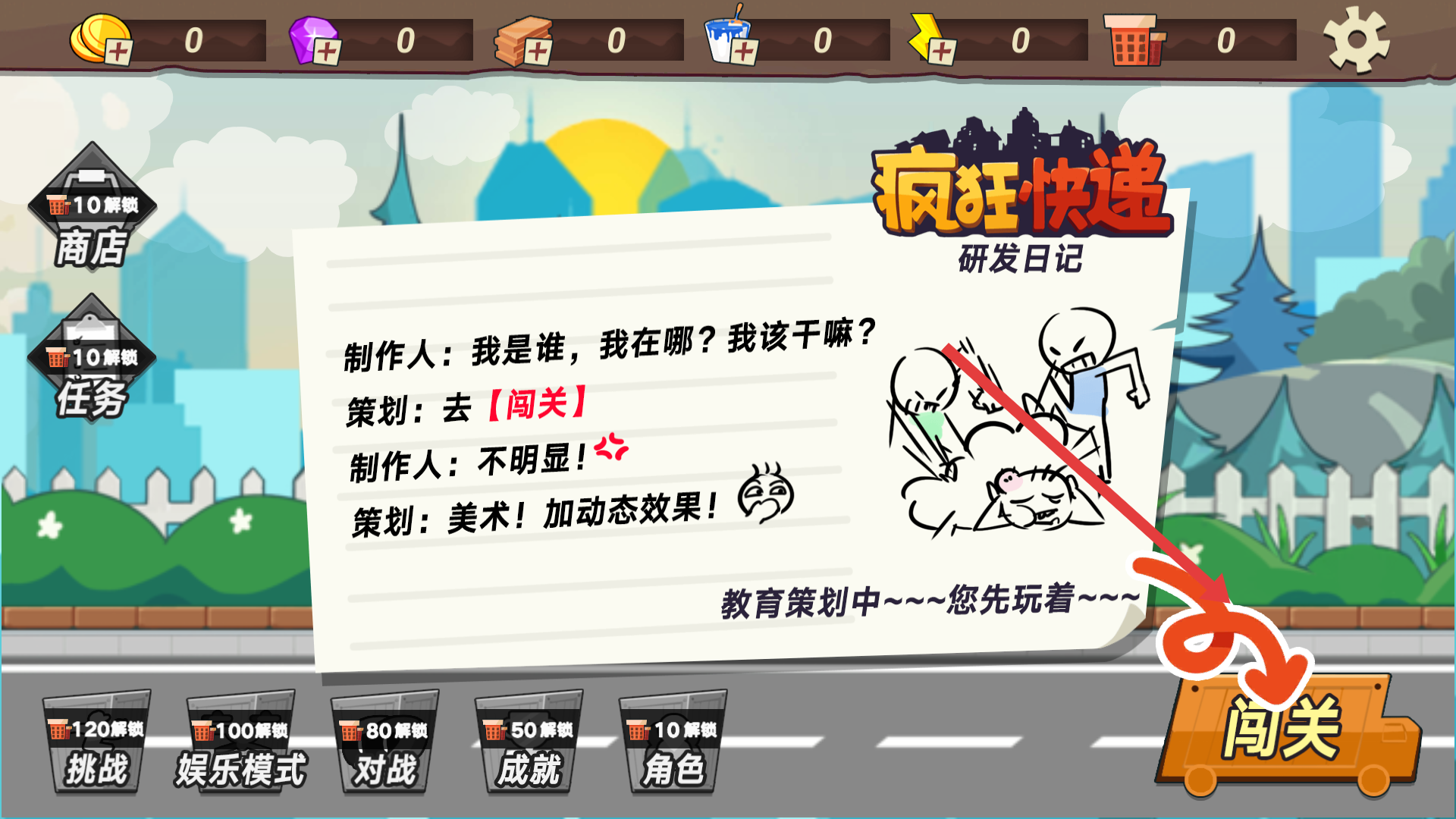 1、進(jìn)入【瘋狂快遞-研發(fā)日記】界面后,點(diǎn)擊界面中的【闖關(guān)】按鈕開(kāi)啟玩法,同時(shí)可留意【商店】【任務(wù)】等功能,后續(xù)可解鎖對(duì)應(yīng)內(nèi)容。