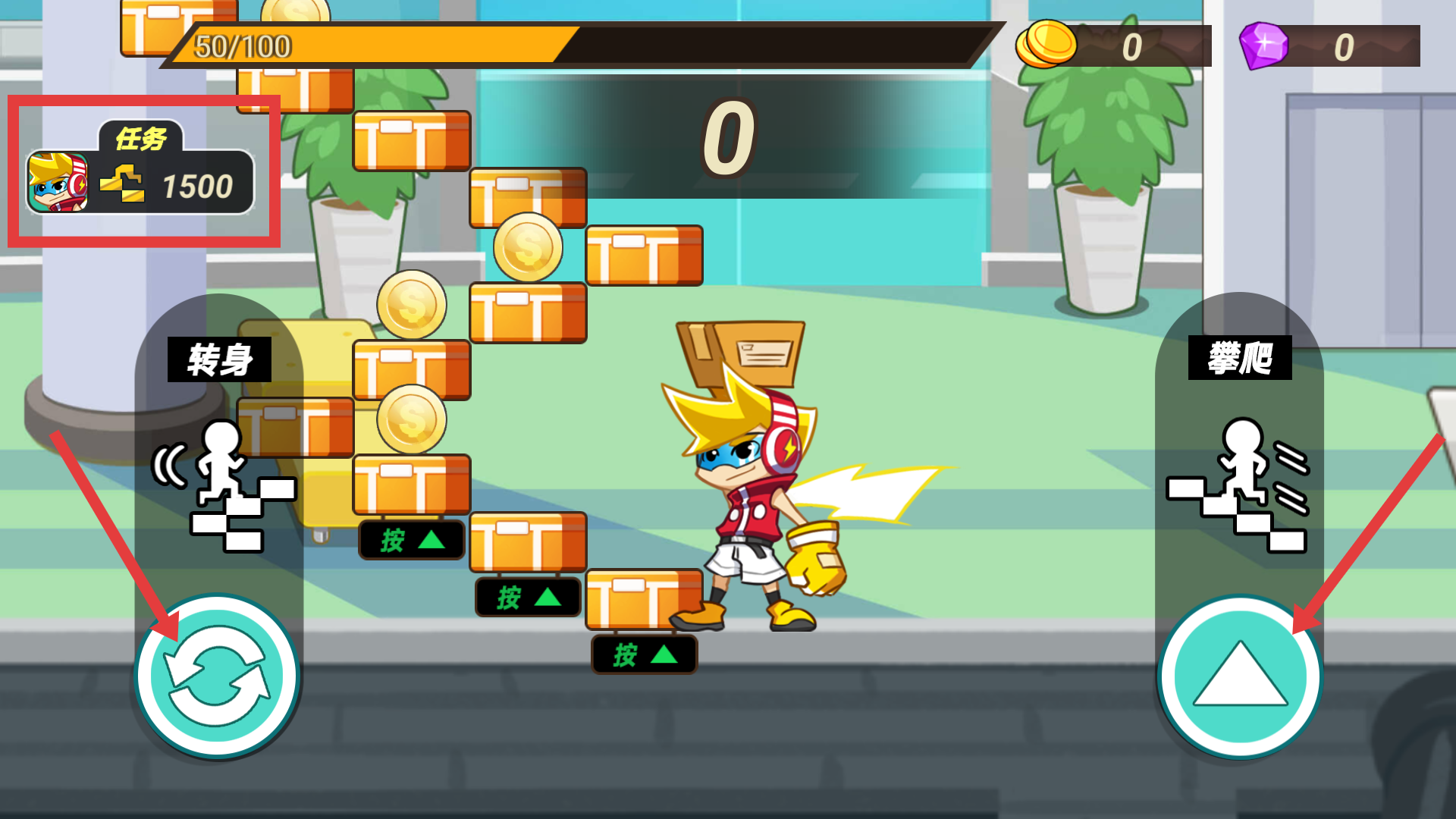2、進(jìn)入闖關(guān)界面后,關(guān)注【任務(wù)-1500】進(jìn)度,點(diǎn)擊【攀爬】對(duì)應(yīng)的三角形按鈕操作角色,左鍵按鈕轉(zhuǎn)身,推進(jìn)游戲進(jìn)程。