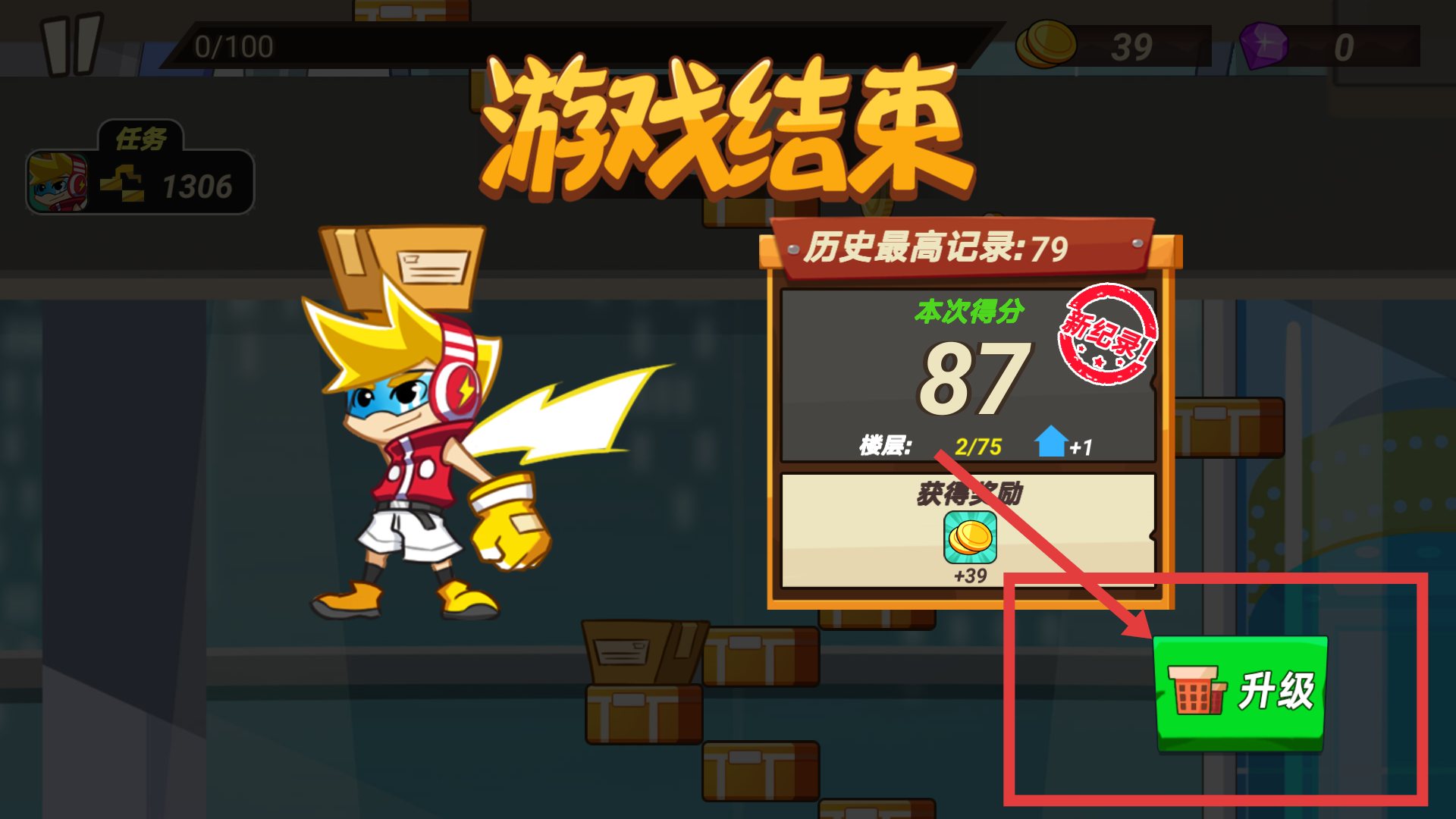 4、游戲結(jié)束后,查看本次得分【87】,點(diǎn)擊界面中的【升級(jí)】按鈕,可提升角色相關(guān)能力以便后續(xù)闖關(guān)。