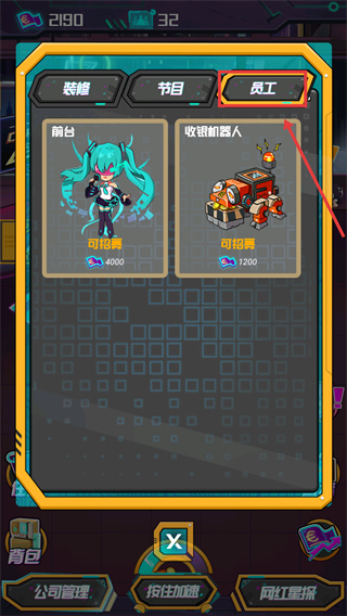 3、切換到【員工】界面,可招募【前臺(tái)-4000】或【收銀機(jī)器人-1200】等角色,提升工作室的運(yùn)營效率。