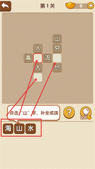 1、選擇下方的【山】字,填入對應(yīng)空格,補全【山高水長】與【山窮水盡】這兩個成語,完成該關(guān)卡的成語填空任務(wù)。