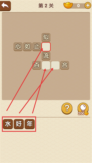 2、選取下方的【水】【好】【年】,分別填入對應(yīng)空格,補全【心如止水】與【百年好合】這兩個成語,推進(jìn)關(guān)卡進(jìn)度。