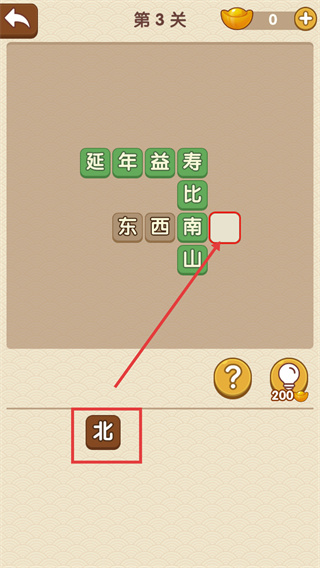 3、將下方的【北】字填入對應(yīng)空格,與現(xiàn)有【東】【西】【南】組成【東南西北】,完成該關(guān)卡的方位類內(nèi)容填空。