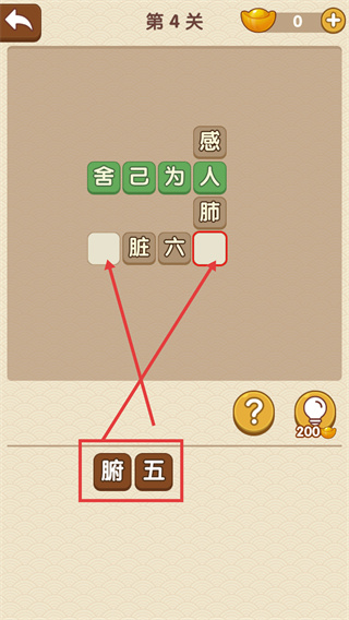 4、選擇下方的【腑】【五】,填入對應(yīng)空格,補全【感人肺腑】與【五臟六腑】這兩個成語,完成本關(guān)的填空任務(wù)。