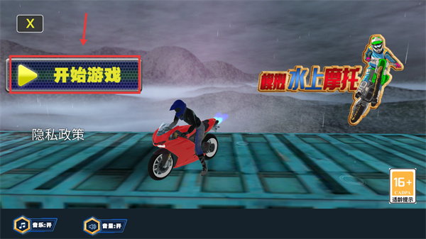 1、點擊【開始游戲】進入【模擬水上摩托】關(guān)卡,可先調(diào)整音樂和音量設(shè)置以優(yōu)化體驗。