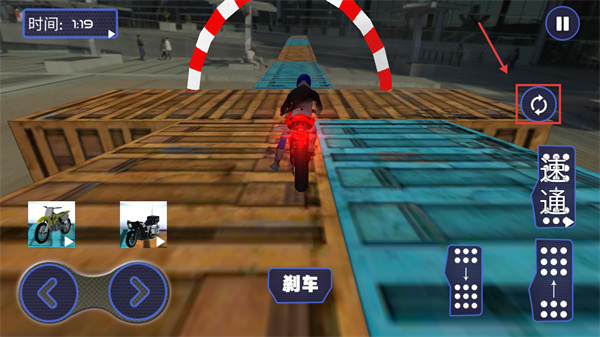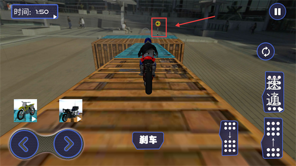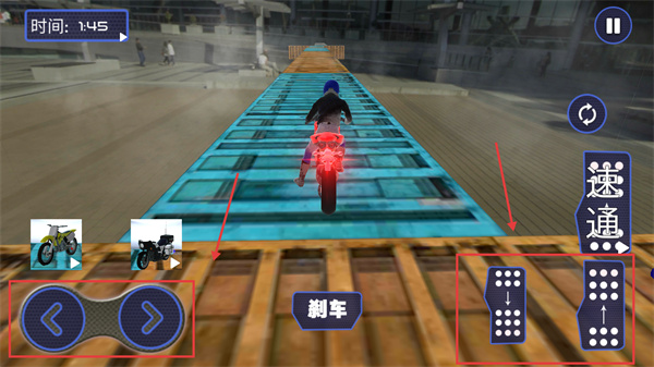 2、駕駛時用方向鍵控制摩托轉(zhuǎn)向,結(jié)合油門/剎車按鍵調(diào)節(jié)速度,在窄道場景中需精準操控避免掉落。
