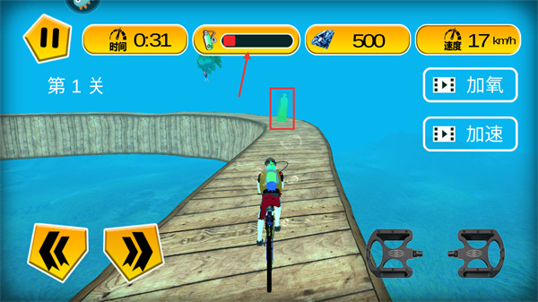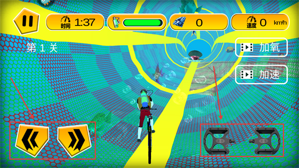 2、利用左右方向鍵調(diào)整騎行方向,通過(guò)踏板按鍵控制速度,在管道場(chǎng)景中需精準(zhǔn)轉(zhuǎn)向避免碰壁。