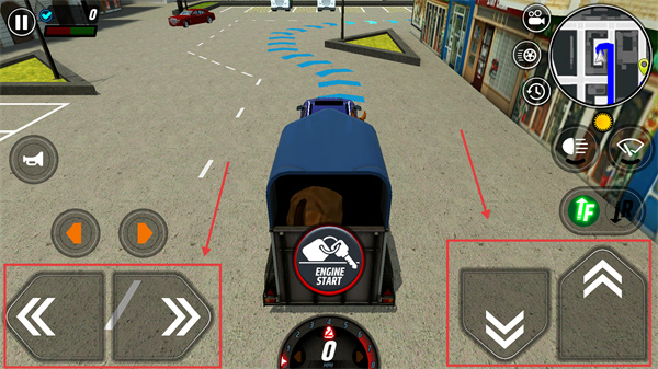 2、駕駛時先點擊【ENGINE-START】啟動車輛,通過左右箭頭控制方向,上下箭頭調(diào)節(jié)速度,注意避開障礙。