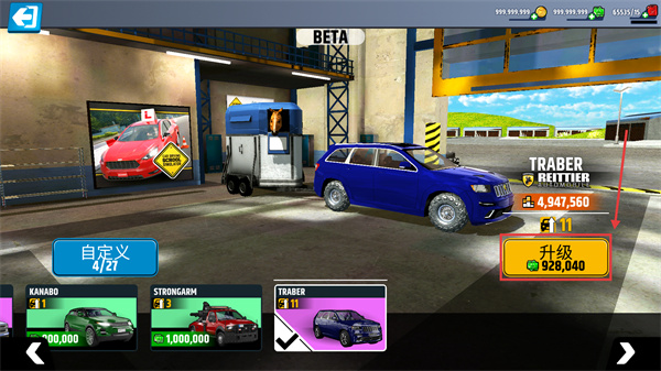 4、完成任務(wù)后進入車庫,可使用【升級-9280400】提升【TRABER-RETTTER】車輛屬性,也可自定義車輛外觀。