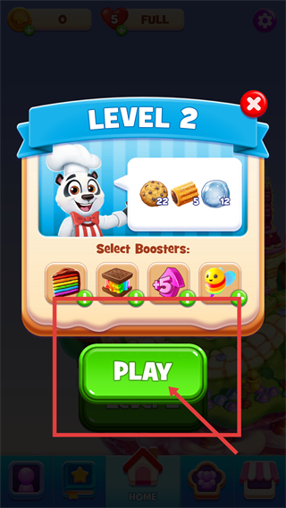 1、在【LEVEL-2】界面,確認(rèn)收集目標(biāo)【餅干-22】【卷-3】【冰塊-12】,選booster后點(diǎn)擊【PLAY】按鈕,進(jìn)入該關(guān)卡開(kāi)始消除挑戰(zhàn)。