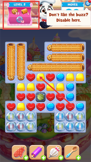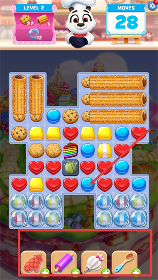 3、剩余【28-MOVES】時(shí),利用底部道具提升消除效率,持續(xù)推進(jìn)【餅干】【卷】【冰塊】的收集目標(biāo)進(jìn)度。
