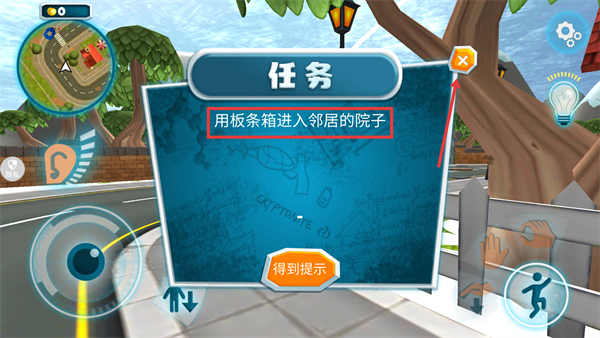 1、接取【用板條箱進(jìn)入鄰居的院子】任務(wù),若操作不明可點擊【得到提示】獲取指引,推進(jìn)任務(wù)流程。