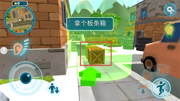 2、根據(jù)任務(wù)指引找到板條箱,跟隨綠色箭頭提示靠近并拿起板條箱,獲取道具。