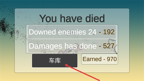 4、顯示【You-have-died】時,可查看【Downed-enemies-24-192】等數據,點擊【車庫】重新改裝戰(zhàn)車。