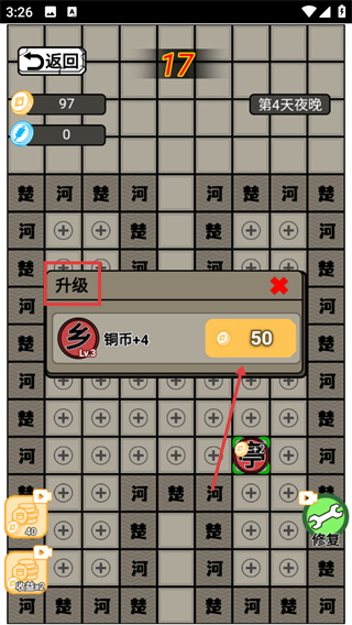3、獲取金幣后可點(diǎn)擊【升級(jí)】按鈕,消耗50金幣提升棋子等級(jí),增強(qiáng)其攻防能力以抵御敵方進(jìn)攻。