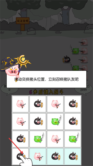 1、在游戲準(zhǔn)備界面,按提示拖動(dòng)【豬頭】交換格子位置,召喚對(duì)應(yīng)豬隊(duì)友。