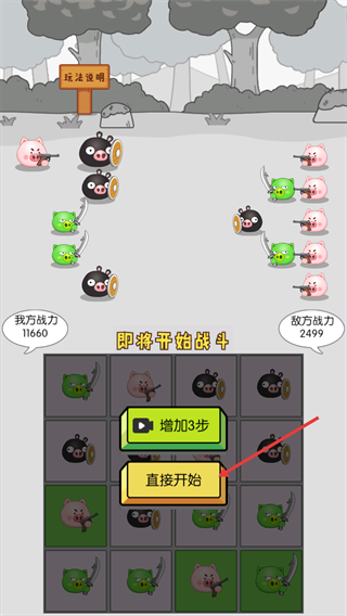 2、完成隊(duì)伍配置后,點(diǎn)擊【直接開始】按鈕,進(jìn)入戰(zhàn)斗環(huán)節(jié)。