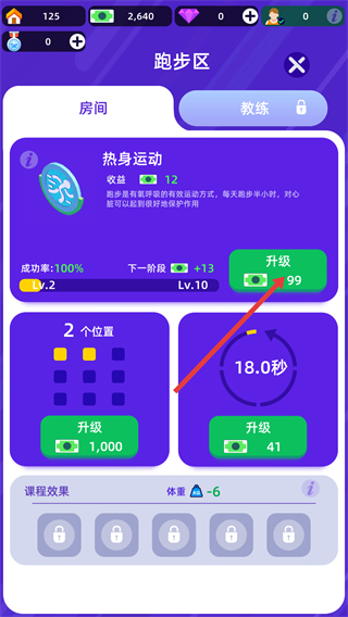 3、在跑步區(qū)界面點擊綠色的【升級】按鈕,消耗【99】金幣提升熱身運(yùn)動等級,增加每階段收益。