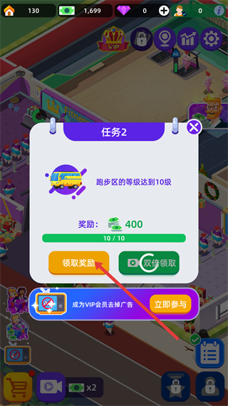 4、任務(wù)進(jìn)度達(dá)成后點擊【領(lǐng)取獎勵】按鈕獲取【400】金幣,也可選擇看廣告雙倍領(lǐng)取加速發(fā)展。