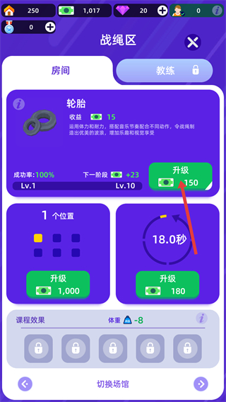 3、戰(zhàn)繩區(qū)中點擊輪胎設(shè)施的升級按鈕,消耗150金幣提升等級增加收益。