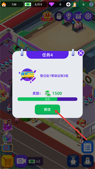 1、完成【任務(wù)4】中【登記處1】等級到3級的要求,點(diǎn)擊前往按鈕推進(jìn),可獲得1500獎勵提升健身房初期發(fā)展。