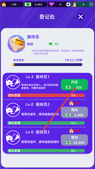 2、在登記處界面升級【接待員1】,提升接待速度,減少排隊數(shù)量,讓顧客更快進(jìn)入健身房。