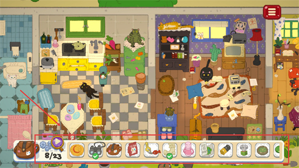 4、底部物品欄進度隨時更新,繼續(xù)在場景中尋找剩余物品以推進關(guān)卡進度。