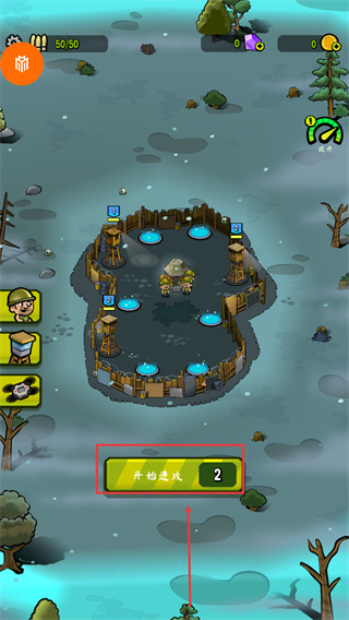 1、開局優(yōu)先在基地內(nèi)部署哨塔升級(jí)防御,并注意維持【50/50】人口上限,資源充足時(shí)及時(shí)點(diǎn)擊【提升】按鈕增強(qiáng)實(shí)力。