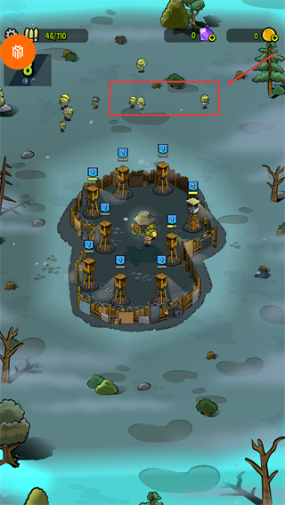 2、合理分配火力優(yōu)先消滅被紅框標(biāo)記的【僵尸】群,利用不同等級(jí)的崗哨塔形成交叉火力網(wǎng)。