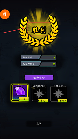 3、勝利后可獲得【88】黃金等獎(jiǎng)勵(lì),在【選擇獎(jiǎng)勵(lì)】界面,根據(jù)當(dāng)前需求在【寶石】、【Drone-Damage】和塔樓傷害升級(jí)中做出選擇。