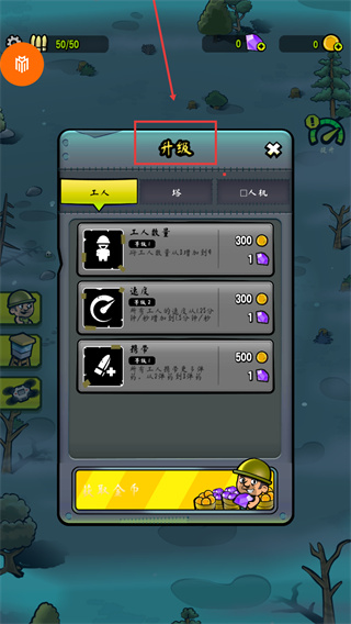 4、在【升級(jí)】面板的【工人】頁,優(yōu)先用【300】金幣和【1】寶石升級(jí)【工人數(shù)量】至【4】名。