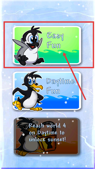 1、選擇關(guān)卡開始游戲,保護(hù)冰塊上的企鵝寶寶,避開玩耍的企鵝,開始收集冰塊幫助國(guó)王。