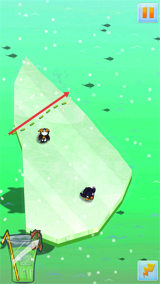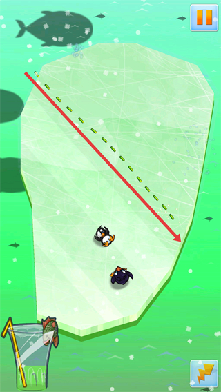 3、調(diào)整切割角度確保冰塊掉落,避開企鵝寶寶的位置,將海豹隔離到邊緣區(qū)域,順利收集冰塊完成任務(wù)。