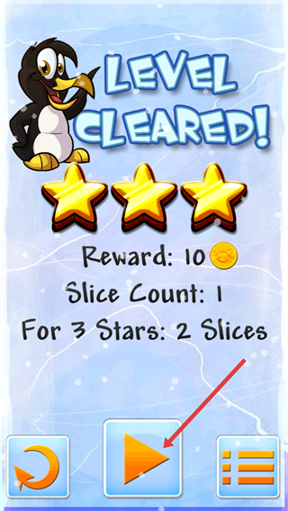 4、完成關(guān)卡獲得【三顆星星】和金幣獎(jiǎng)勵(lì),點(diǎn)擊繼續(xù)按鈕挑戰(zhàn)下一關(guān),保持高效切割獲取更多獎(jiǎng)勵(lì)。