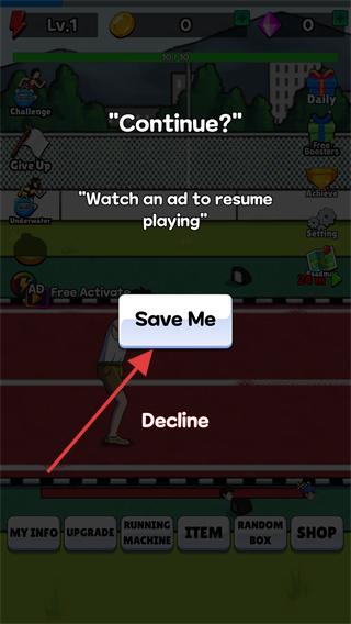 4、若比賽失利出現(xiàn)【Continue?】提示,點(diǎn)擊【Save-Me】按鈕觀看廣告,即可復(fù)活繼續(xù)游戲。