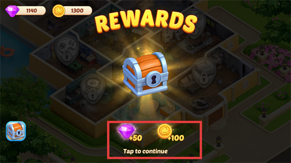 4、通關后點擊領取寶箱的獎勵,繼續(xù)探索更多消除關卡打造家園。