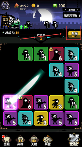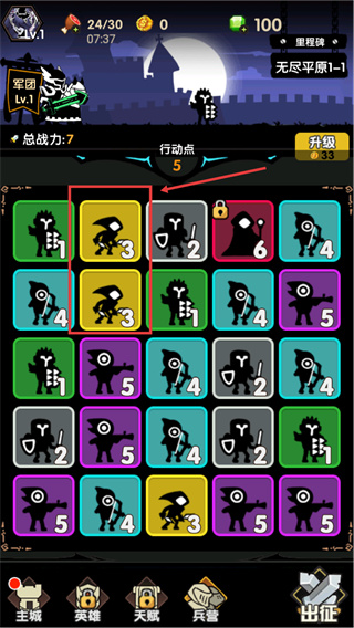 2、在【無盡平原1-1】場(chǎng)景中,利用【行動(dòng)點(diǎn)】選擇數(shù)值為3的單位合成,可提升【總戰(zhàn)力】,初始總戰(zhàn)力為7。