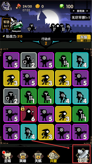 4、當(dāng)陣容搭配完成后,點(diǎn)擊界面底部的【出征】按鈕,即可讓軍團(tuán)進(jìn)入【無盡平原1-1】場(chǎng)景戰(zhàn)斗。