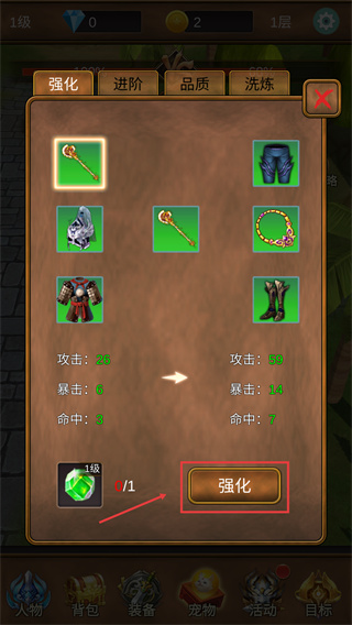4、通過【強化】功能消耗對應(yīng)道具,提升裝備的【攻擊】【暴擊】等屬性,增強角色的戰(zhàn)斗能力。
