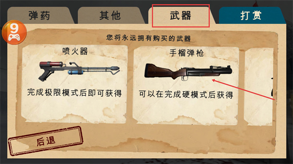 4、【武器】界面中,完成【極限模式】可獲【噴火器】,完成【硬模式】能得【手榴彈槍】,購(gòu)買的武器會(huì)永久持有。