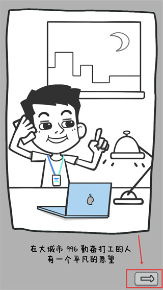 1、點(diǎn)擊界面箭頭按鈕推進(jìn)劇情,了解【在大城市-996-勤奮打工的人】的背景,開(kāi)啟后續(xù)攢錢買草房的主線任務(wù)。