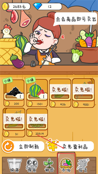 4、進(jìn)入【市場(chǎng)】界面,點(diǎn)擊帶有“小賺”標(biāo)識(shí)的商品即可賣出獲利,利用【賣光盈利品】功能快速變現(xiàn)資源。