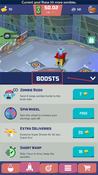 4、打開【BOOSTS】界面,使用金幣解鎖【ZOMBIE-RUSH】等增益效果,快速提升僵尸屬性。